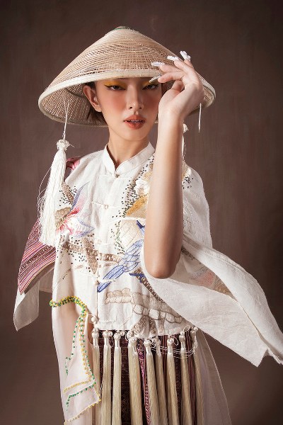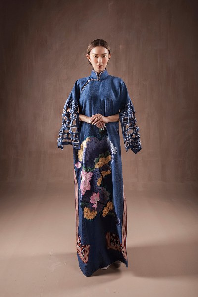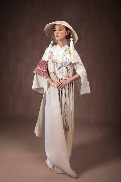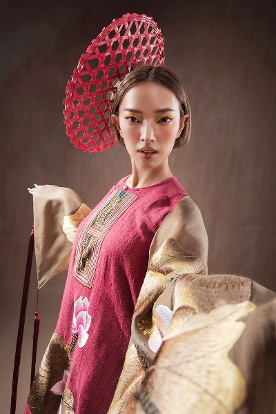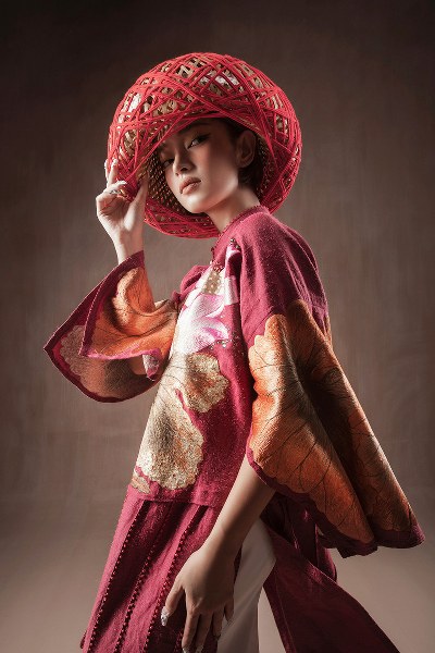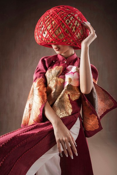 Để tạo ra những thước vải tự nhiên và độc đáo, sợi dứa dệt cùng sợi tơ tằm, sau đó nhuộm màu thủ công. Trên nền chất liệu mới, anh tiếp tục khai thác thế mạnh về phom dáng áo dài thập niên 1930.