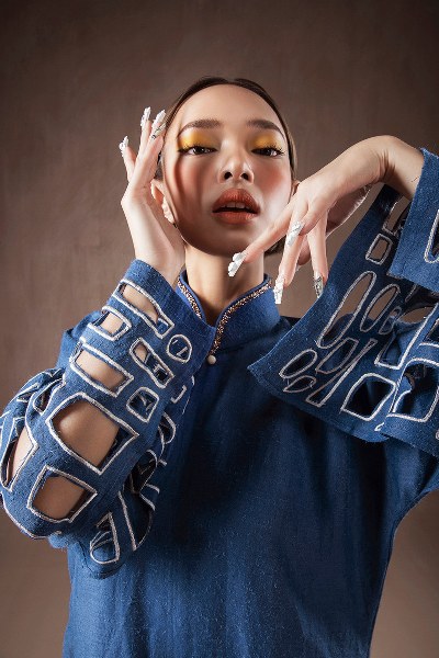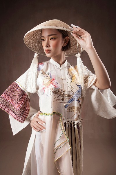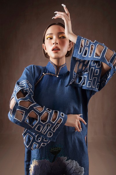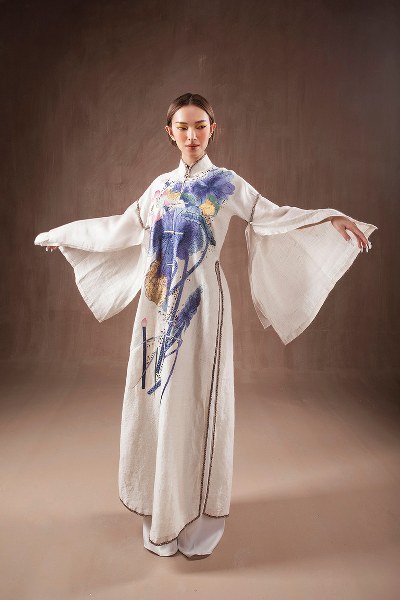 Các thiết kế cách điệu ở phần ống tay loe, tạo nên diện mạo trẻ trung và phóng khoáng. Họa tiết hoa lá, chim chóc thêu tay kỳ công càng nổi bật hơn nhờ dát vàng.