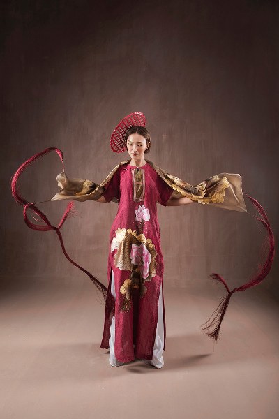 Họa tiết sen cách điệu trên chất liệu sợi tơ tằm kết hợp với sợi lá dứa cùng kỹ thuật dát vàng điêu luyện tạo nên sự sang trọng, đẳng cấp cho tà áo dài truyền thống.