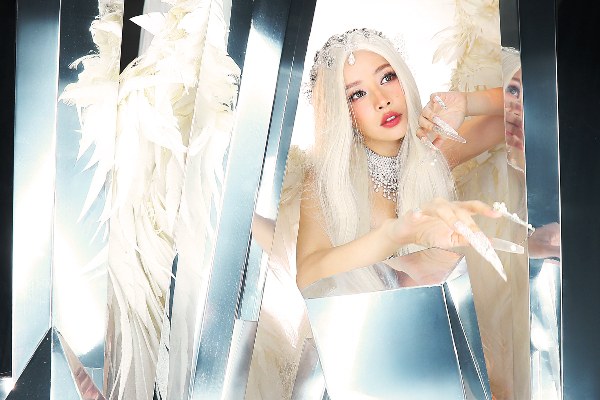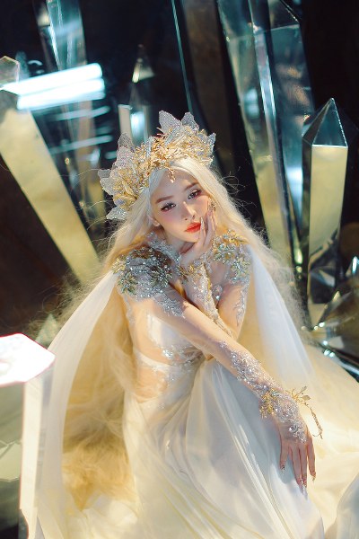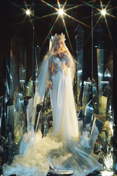 Giữa những khối pha lê 3D, lồng kính và hình ảnh từ màn hình LED, Chi Pu đội vương miện kết từ những cánh bướm bằng ren trắng, khoe dáng trong bộ đầm cut-out đắp vải xuyên thấu. Video: Tee Le