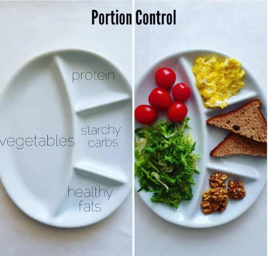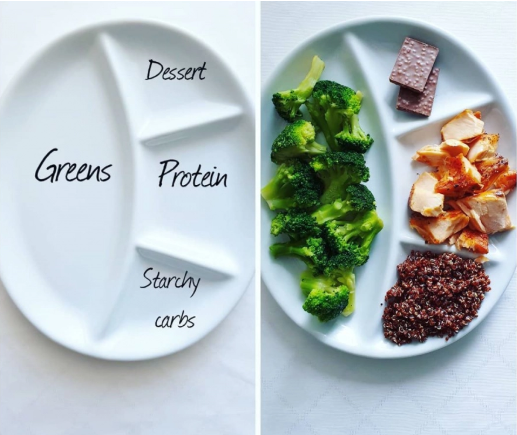 Chiếc đĩa này là một cách chia sẵn thức ăn vô cùng hiệu quả. Trong đó gồm 1 ngăn to chiếm nửa đĩa, và 3 ngăn nhỏ. Mỗi ngăn sẽ tương ứng với từng món ăn riêng biệt, ngăn to nhất là rau xanh/salad; 3 ngăn còn lại là tinh bột, protein và món tráng miệng. Điều bạn cần là đó là sắp xếp thức ăn theo đúng khẩu phần của 3 ngăn này là các chị em đã có bữa ăn dinh dưỡng vừa đủ chất. Chắc chắn khi áp dụng cách này bạn sẽ có được tip giảm cân hiệu quả, đảm bảo bản thân luôn no chứ không bao giờ sợ đói luôn nhé.
