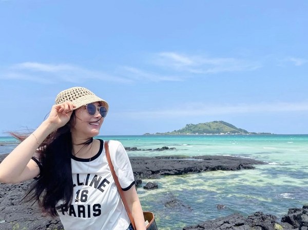Diễn viên khoe sắc vóc trong bộ ảnh nghỉ dưỡng ở biển, kết hợp áo thun Celine, mũ dệt kim cùng túi xách bản to.