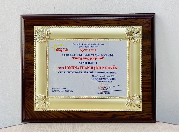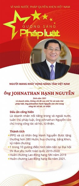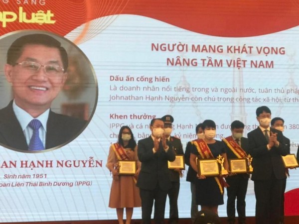 Với những đóng góp tích cực trong công tác xây dựng, tổ chức và thi hành pháp luật, qua đó lan tỏa những hình ảnh đẹp, góp phần xây dựng đất nước, Chủ tịch IPPG - ông Johnathan Hạnh Nguyễn được tôn vinh Gương sáng Pháp luật 2021.