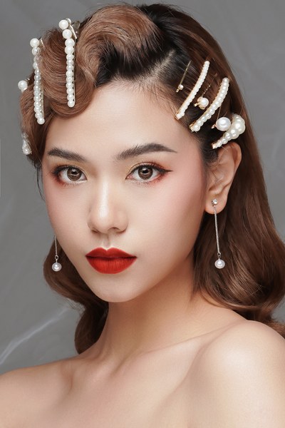 Môi đỏ cam san hô, tóc uốn phồng cổ điển