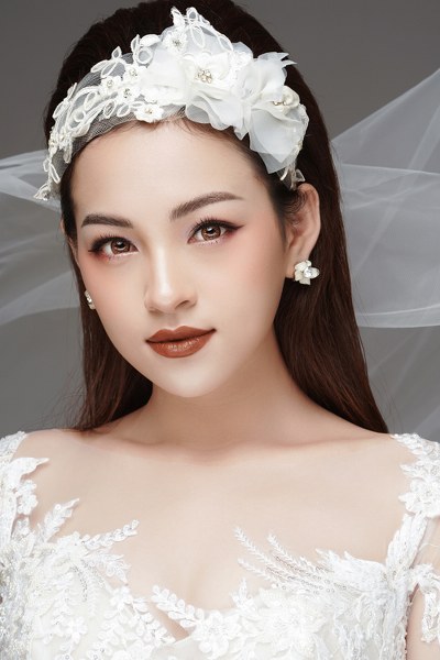 Đôi mắt được kẻ eyeliner ở mí trên, mí dưới tạo sự khác biệt cho diện mạo của cô dâu. Phấn má hồng được nhấn ở đỉnh xương gò má tạo vẻ tươi tắn. Son cam phủ ở lòng môi giúp tô vẻ trẻ trung của cô dâu.