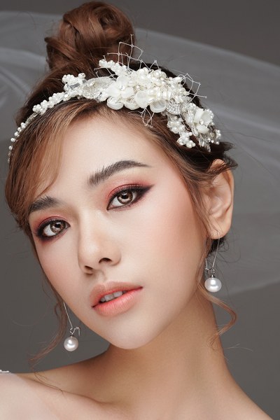 Một kiểu trang điểm dành riêng cho các ‘nàng bánh bèo’, tôn nhan sắc trong sáng, thanh tú của cô dâu. Bầu mắt được phủ phấn màu trắng và dần chuyển sang hồng đậm về phía đuôi để tạo chiều sâu. Phấn bắt sáng được phủ lên những điểm gồ của gương mặt (vùng chữ T và đỉnh xương gò má) giúp gương mặt tươi tắn, rạng rỡ.