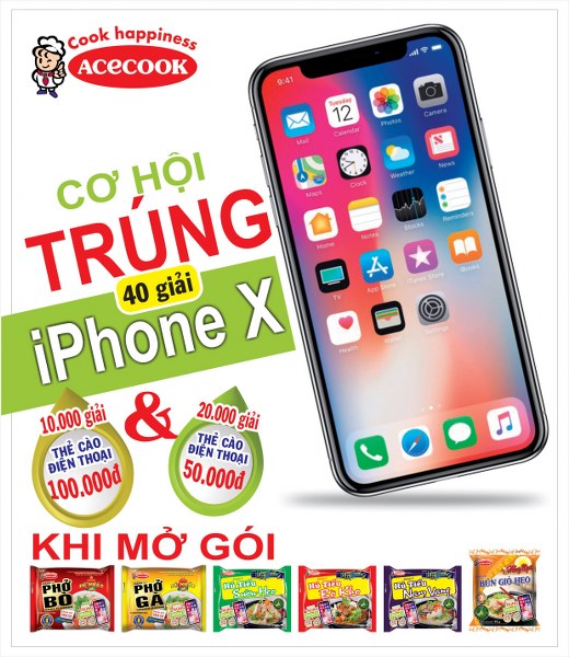 Chương trình khuyến mại "Cơ hội trúng Iphone X" khi mua các sản phẩm Phở ăn liền Đệ Nhất Phở hương vị Phở Bò; Phở ăn liền Đệ Nhất Phở hương vị Phở Gà; Bún ăn liền Hằng Nga hương vị Bún Giò Heo; Hủ tiếu ăn liền Nhịp Sống hương vị Hủ Tiếu Sườn Heo; Hủ tiếu ăn liền Nhịp Sống hương vị Hủ Tiếu Bò kho và Hủ tiếu ăn liền Nhịp Sống hương vị Hủ Tiếu Nam Vang.