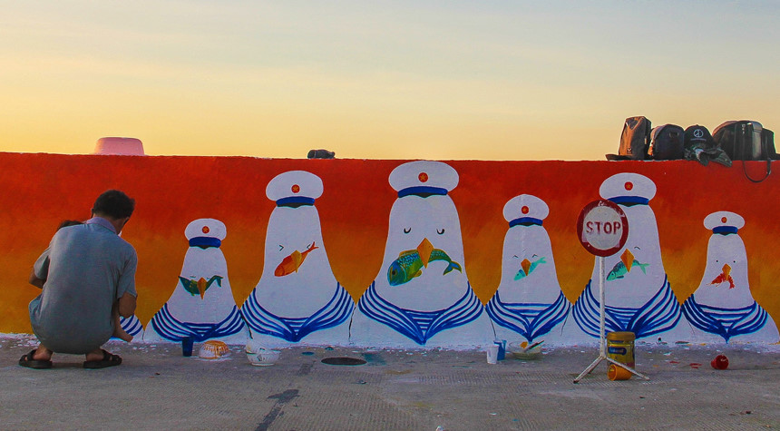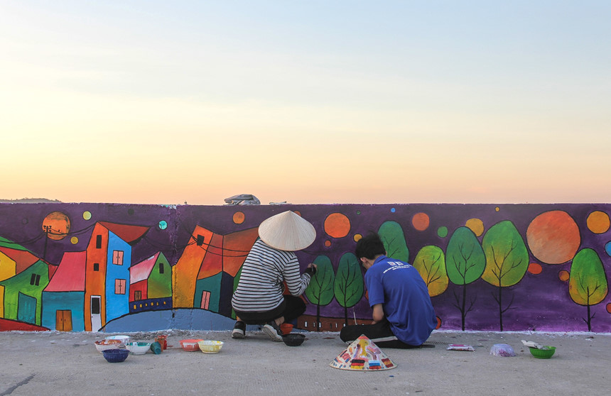 Dưới cái nắng gay gắt của mùa hè, những sinh viên chủ yếu đến từ khoa kiến trúc, Đại học Đách Khoa – Đại học Đà Nẵng đang cặm cụi tô vẽ, tạo nên con đường nghệ thuật đầu tiên cho hòn đảo Lý Sơn. Được biết, đây là công trình thanh niên tuổi trẻ thành phố Đà Nẵng do đoàn trường phát động với hy vọng sẽ tạo thêm điểm nhấn cho hòn đảo Lý Sơn để thu hút khách du lịch.