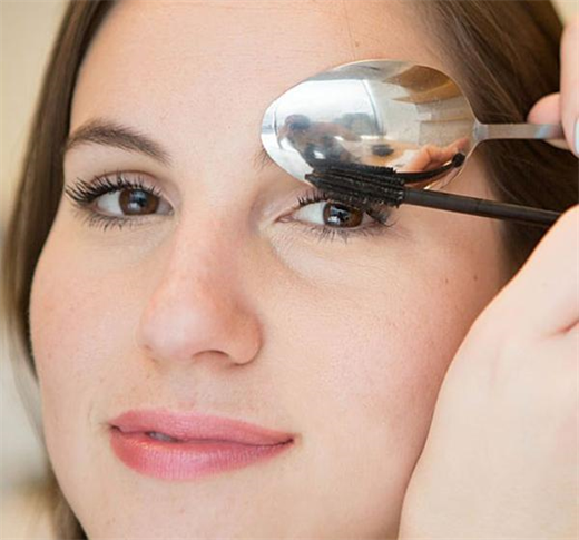 Đặt chiếc thìa nằm ngang, đầu thìa hướng ra ngoài, tiếp đến là vuốt hàng mi cong theo hình dáng của chiếc thìa, sau đó chải mascara và dùng thìa uốn thêm một lần nữa là được.