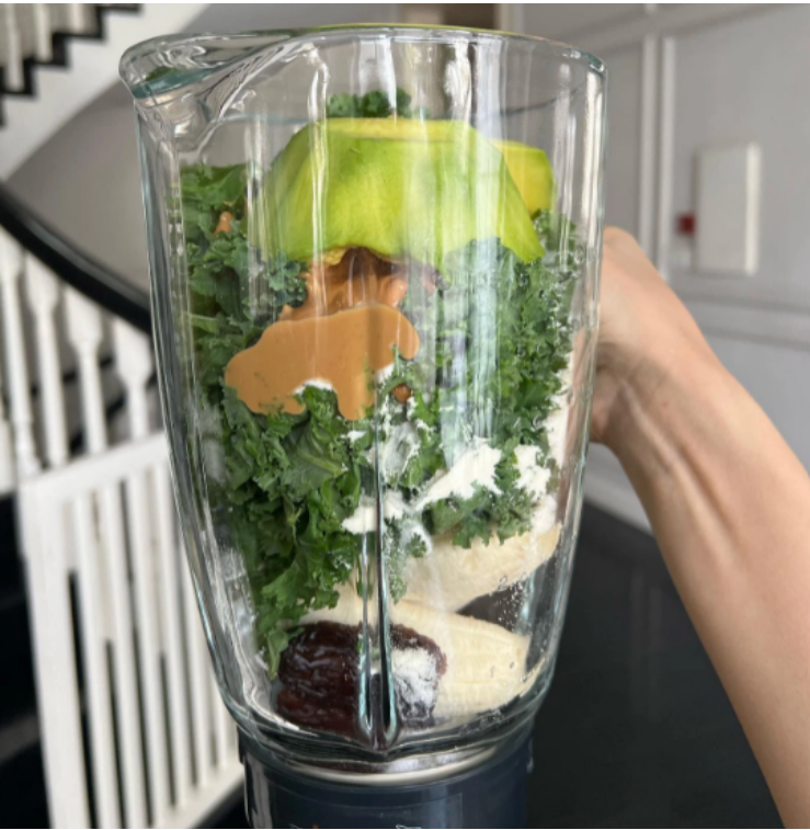 Một công thức khác mà cô yêu thích là rau cải xoăn, bơ, chuối, bột collagen, quả chà là, sữa tươi/ sữa hạnh nhân. Cô để sẵn các loại trái cây, rau củ trong tủ đông theo từng phần nhỏ; đến sáng, cô chỉ cần cho tất cả vào máy xay đều là có ngay ly sinh tố rau ngon lành, bổ dưỡng cho gia đình.