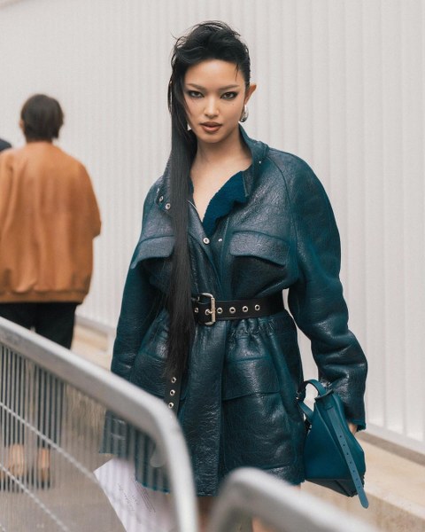 Fashionista Châu Bùi tới dự với áo khoác da và giày lông nhân tạo, trang điểm và làm tóc theo phong cách punk.