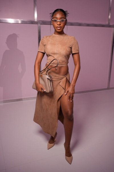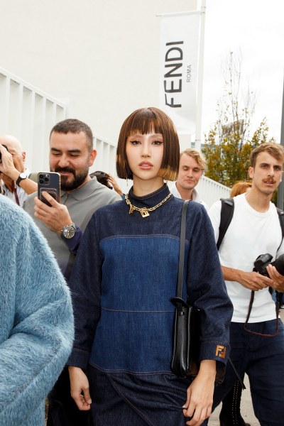 Ngôi sao Hàn Quốc là tâm điểm khi xuất hiện ở show Xuân Hè 2025 của Fendi hôm 17/9. Cô chọn bộ quần áo màu xám, quần ống loe.