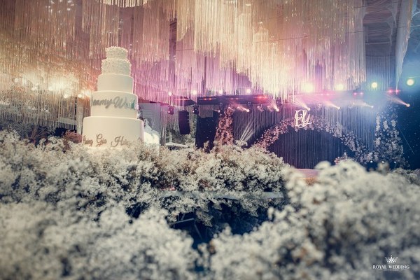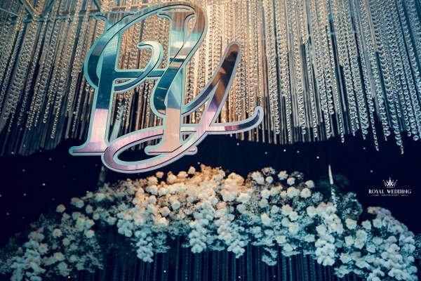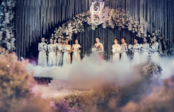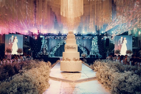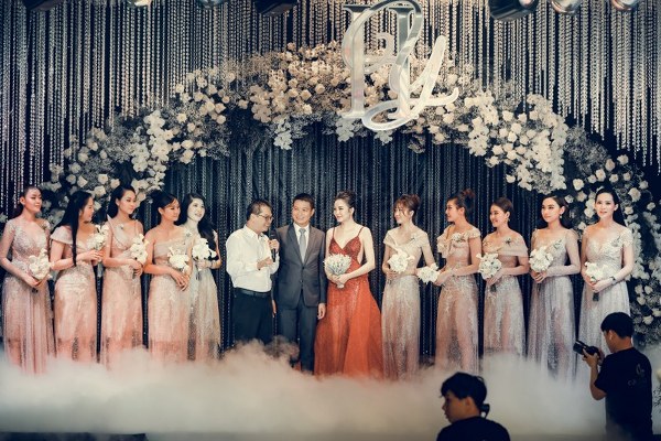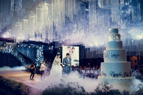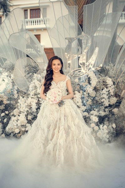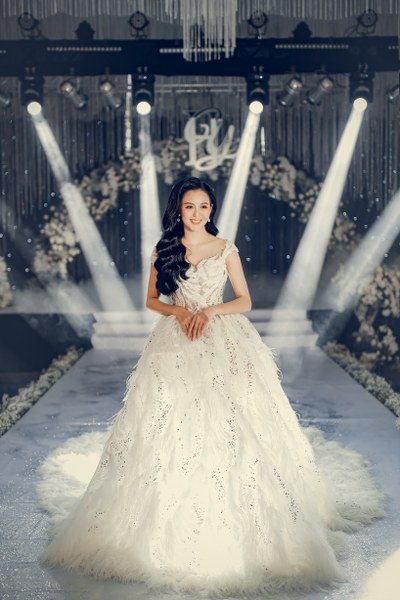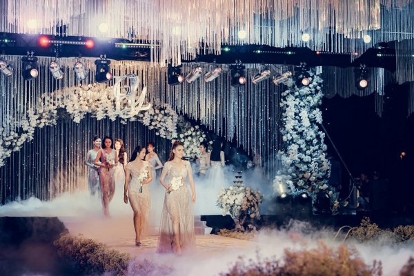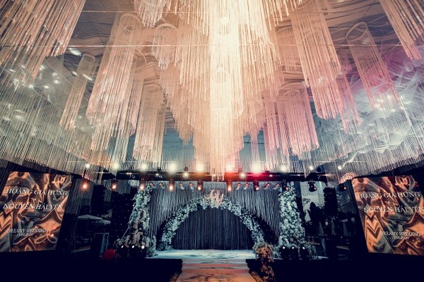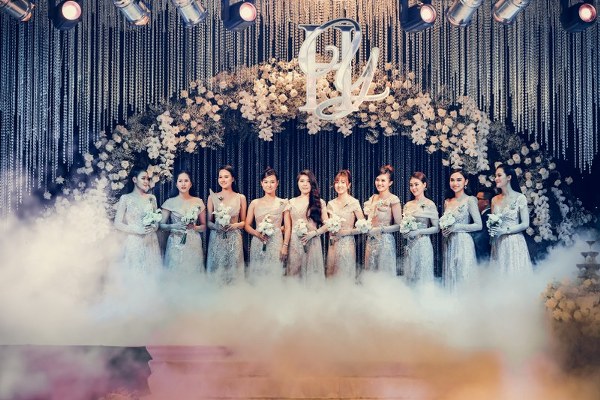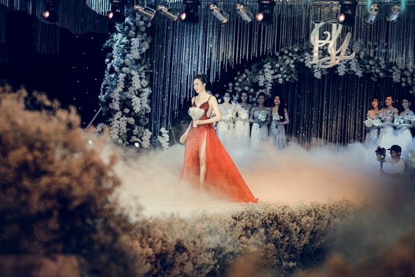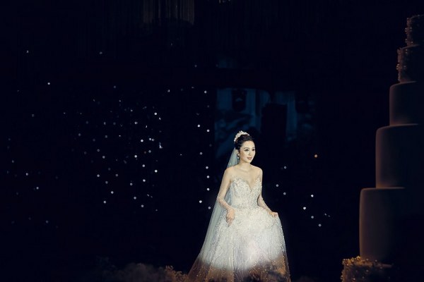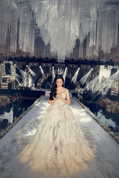 Chưa hết, sân khấu hành lễ còn được trang trí nổi trên mặt nước, giăng đầy đèn treo chẳng khác nào hoàng cung, kèm với ngọc trai sáng lấp láng. Đại diện nhà cô dâu cũng cho biết, để làm được sân khấu xa hoa như thế này, đã phải dùng đến gần 1 triệu viên ngọc trai, 1,5 tấn pha lê… và hàng chục ngàn mét các phụ kiện khác. Để chuẩn bị cho sự kiện, ekip Cửu Long Event còn chuẩn bị kĩ lưỡng từ sân khấu, chỗ ngồi của khách mời, khu vực tiếp đón khách mời… Hoa tươi phủ kín trong không gian tràn ngập ánh sáng như cổ tích. Từ cổng vào, hàng chục ngàn cành hoa baby trắng được kết nối tạo cho khách mời có cảm giác đang bước vào một khu vườn cổ tích trong mơ, hai bên lối đi vào sảnh tiệc được trang trí bằng hàng loạt những tấm ảnh cưới khổ lớn, toàn bộ không gian được trang trí đầy hoa tươi với gam màu chủ đạo là màu trắng, bạc. Phía trên hội trường sân khấu chính, những chiếc đèn pha lê mềm mại được thả buông xuống tạo nên cảm giác mơ màng, vô thực. Cùng với đó, màn hình hiệu ứng hiển thị một bầu trời đêm với hàng ngàn sao rực rỡ khiến cho không gian bỗng chốc biến đổi từ siêu thực đến cảnh tượng đẹp như thiên đường. Bục sân khấu được thiết kế nổi trên mặt nước cho nên khách mời còn cảm thấy bị choáng ngợt trước những hình ảnh phản chiếu của pha lê trên mặt nước, nhất là khi cô dâu chú rể cầm tay nhau bước đi trong không gian cổ tích này. Chị Tuyết Nhung cùng toàn bộ ekip Cửu Long Studio đã vất vả làm việc liên tục hàng tuần liền để hoàn thiện mọi thiết kế, để dành cho cô dâu một đám cưới hoàn hảo, mĩ mãn. Bà "bầu" Tuyết Nhung được nhiều người biết đến không chỉ là một nhiếp ảnh gia, bà chủ của Hệ thống Cửu Long ELLi Group mà còn là người dẫn dắt, đồng hành trên con đường đến với công chúng của nhiều gương mặt nổi tiếng như Nam Vương TG Tiến Đoàn, HHVN Đặng Thu Thảo, siêu mẫu Kim Cương, DVĐA Nhan Phúc Vinh, Á hậu Đại dương Thanh Ngân, Hoa hậu HVVN được yêu thích Sang Lê, cũng như các thế hệ Hoa khôi của Đồng bằng Sông Cửu Long. Phụ trách phần trang phục cưới là nhà thiết kế nổi tiếng Lâm Lâm. Tại đám cưới, nhân vậy chính đã diện chiếc váy đính kết hơn 20 ngàn viên đá Swarovski lớn nhỏ cùng với phần hoạ tiết đính kết lông vũ và hạt cườm được thiết kế cầu kỳ, tôn lên vẻ đẹp kiêu sa của Hoa khôi. Chiếc váy được đánh giá là một "kỳ quan" khi khoác lên người cô dâu. Đây cũng là thiết kế rất tâm huyết của nhà thiết kế Lâm Lâm khi tự tay anh làm thủ công trong suốt 30 ngày dành cho cô dâu. Ngoài ra, Lâm Lâm còn thiết kế thêm 2 chiếc váy cưới khác để cô dâu mặc trong sự kiện trọng đại này. NTK Lâm Lâm cho biết, để may đo và thiết kế riêng cho đám cưới như "bước ra từ cổ tích" này, bản thân anh đã bỏ ra hàng ngàn giờ làm việc của rất nhiều thợ thủ công chuyên nghiệp, cẩn thận, tỉ mỉ đến từng chi tiết nhỏ. Vì vậy, các khách mời mới được chứng kiến cô dâu trong chiếc váy với phôm dáng xoè, bồng bềnh nhưng trông vẫn nhẹ nhàng, tôn lên nét đẹp thanh thoát của cô dâu. Không những thế, chiếc váy lông vũ mà cô dâu mặc đón khách còn là sự phối hợp ăn ý giữa hạt cườm kết tay, lông vũ và đá ngũ sắc cao cấp. Chính nhà thiết kế đã lên ý tưởng cho toàn bộ bữa tiệc và tính toán phối hợp tất cả phần đèn để có thể tạo nên hiệu ứng tốt nhất cho một phần lễ lung linh, gây choáng ngợp này.