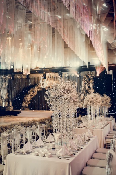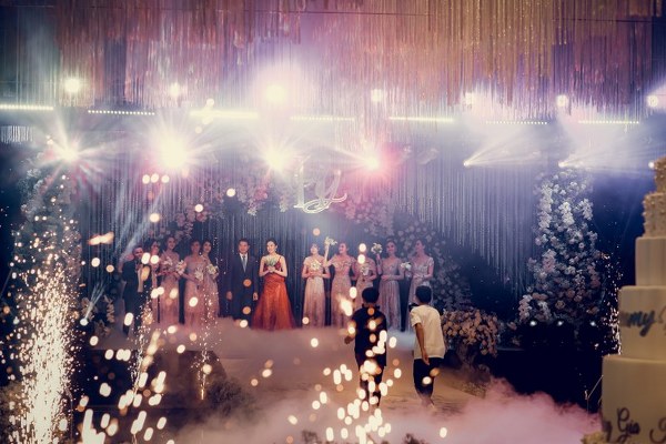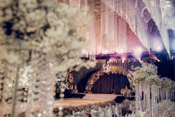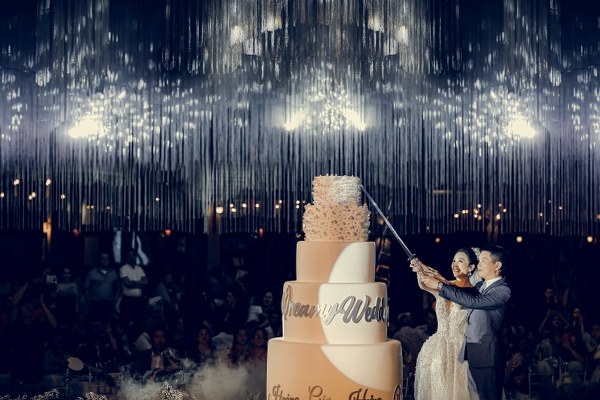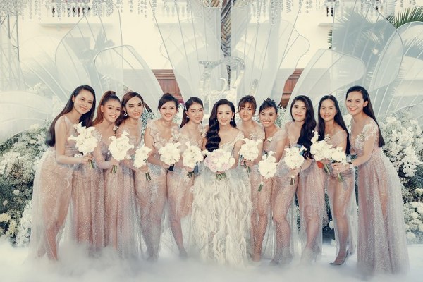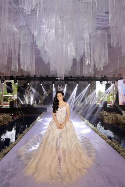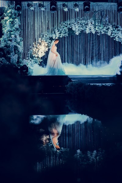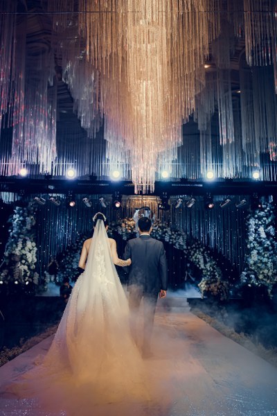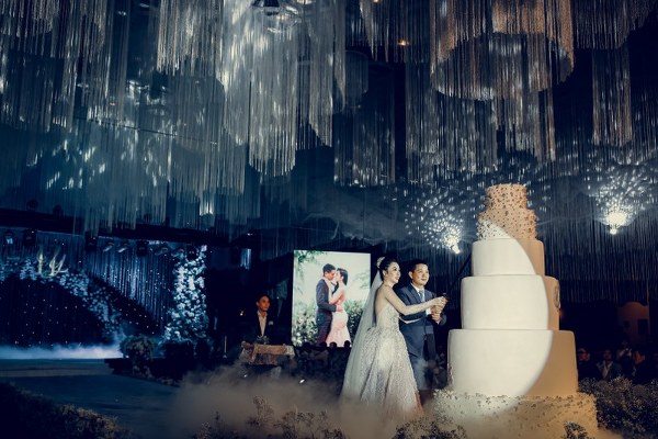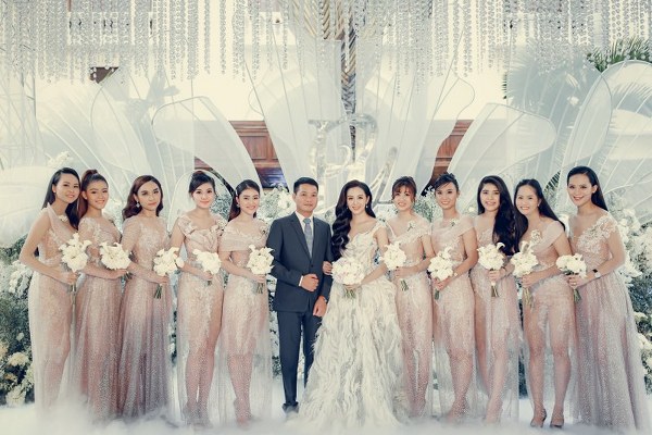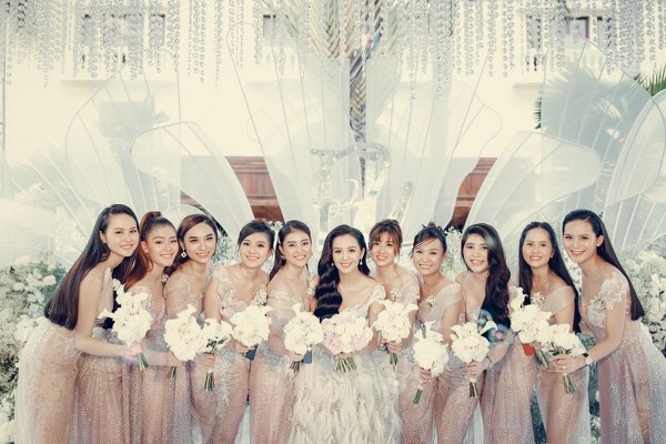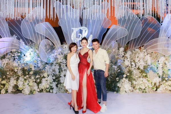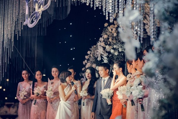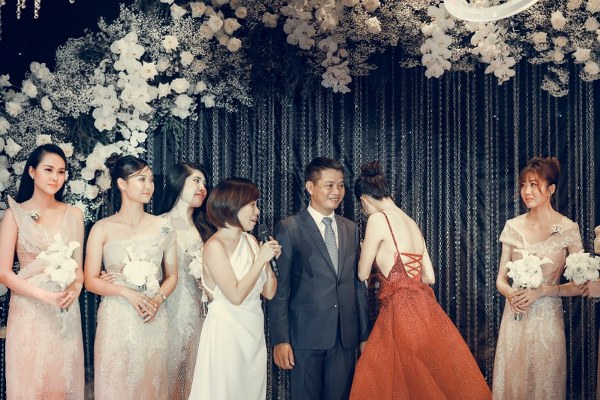 Chưa hết, sân khấu hành lễ còn được trang trí nổi trên mặt nước, giăng đầy đèn treo chẳng khác nào hoàng cung, kèm với ngọc trai sáng lấp láng. Đại diện nhà cô dâu cũng cho biết, để làm được sân khấu xa hoa như thế này, đã phải dùng đến gần 1 triệu viên ngọc trai, 1,5 tấn pha lê… và hàng chục ngàn mét các phụ kiện khác. Để chuẩn bị cho sự kiện, ekip Cửu Long Event còn chuẩn bị kĩ lưỡng từ sân khấu, chỗ ngồi của khách mời, khu vực tiếp đón khách mời… Hoa tươi phủ kín trong không gian tràn ngập ánh sáng như cổ tích. Từ cổng vào, hàng chục ngàn cành hoa baby trắng được kết nối tạo cho khách mời có cảm giác đang bước vào một khu vườn cổ tích trong mơ, hai bên lối đi vào sảnh tiệc được trang trí bằng hàng loạt những tấm ảnh cưới khổ lớn, toàn bộ không gian được trang trí đầy hoa tươi với gam màu chủ đạo là màu trắng, bạc. Phía trên hội trường sân khấu chính, những chiếc đèn pha lê mềm mại được thả buông xuống tạo nên cảm giác mơ màng, vô thực. Cùng với đó, màn hình hiệu ứng hiển thị một bầu trời đêm với hàng ngàn sao rực rỡ khiến cho không gian bỗng chốc biến đổi từ siêu thực đến cảnh tượng đẹp như thiên đường. Bục sân khấu được thiết kế nổi trên mặt nước cho nên khách mời còn cảm thấy bị choáng ngợt trước những hình ảnh phản chiếu của pha lê trên mặt nước, nhất là khi cô dâu chú rể cầm tay nhau bước đi trong không gian cổ tích này. Chị Tuyết Nhung cùng toàn bộ ekip Cửu Long Studio đã vất vả làm việc liên tục hàng tuần liền để hoàn thiện mọi thiết kế, để dành cho cô dâu một đám cưới hoàn hảo, mĩ mãn. Bà "bầu" Tuyết Nhung được nhiều người biết đến không chỉ là một nhiếp ảnh gia, bà chủ của Hệ thống Cửu Long ELLi Group mà còn là người dẫn dắt, đồng hành trên con đường đến với công chúng của nhiều gương mặt nổi tiếng như Nam Vương TG Tiến Đoàn, HHVN Đặng Thu Thảo, siêu mẫu Kim Cương, DVĐA Nhan Phúc Vinh, Á hậu Đại dương Thanh Ngân, Hoa hậu HVVN được yêu thích Sang Lê, cũng như các thế hệ Hoa khôi của Đồng bằng Sông Cửu Long. Phụ trách phần trang phục cưới là nhà thiết kế nổi tiếng Lâm Lâm. Tại đám cưới, nhân vậy chính đã diện chiếc váy đính kết hơn 20 ngàn viên đá Swarovski lớn nhỏ cùng với phần hoạ tiết đính kết lông vũ và hạt cườm được thiết kế cầu kỳ, tôn lên vẻ đẹp kiêu sa của Hoa khôi. Chiếc váy được đánh giá là một "kỳ quan" khi khoác lên người cô dâu. Đây cũng là thiết kế rất tâm huyết của nhà thiết kế Lâm Lâm khi tự tay anh làm thủ công trong suốt 30 ngày dành cho cô dâu. Ngoài ra, Lâm Lâm còn thiết kế thêm 2 chiếc váy cưới khác để cô dâu mặc trong sự kiện trọng đại này. NTK Lâm Lâm cho biết, để may đo và thiết kế riêng cho đám cưới như "bước ra từ cổ tích" này, bản thân anh đã bỏ ra hàng ngàn giờ làm việc của rất nhiều thợ thủ công chuyên nghiệp, cẩn thận, tỉ mỉ đến từng chi tiết nhỏ. Vì vậy, các khách mời mới được chứng kiến cô dâu trong chiếc váy với phôm dáng xoè, bồng bềnh nhưng trông vẫn nhẹ nhàng, tôn lên nét đẹp thanh thoát của cô dâu. Không những thế, chiếc váy lông vũ mà cô dâu mặc đón khách còn là sự phối hợp ăn ý giữa hạt cườm kết tay, lông vũ và đá ngũ sắc cao cấp. Chính nhà thiết kế đã lên ý tưởng cho toàn bộ bữa tiệc và tính toán phối hợp tất cả phần đèn để có thể tạo nên hiệu ứng tốt nhất cho một phần lễ lung linh, gây choáng ngợp này.
