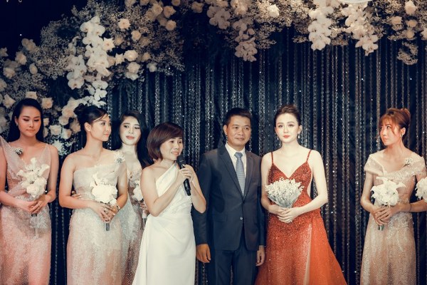 Điểm nhấn cuối cùng không khỏi khiến nhiều người tròn mắt khi cô dâu thay một chiếc váy đỏ chuyển 10 sắc đá Swarovski cùng đôi giày được thiết kế riêng mang nét đẹp kiêu sa.Về thiết kế áo dài cô dâu trong suốt lễ cưới, nhà thiết kế Lâm Lâm đã đưa ra những ý tưởng rất khác biệt. Thông thường người ta vẫn chọn áo dài cưới cho chú rể tone sur tone với cô dâu nhưng ở đây Lâm Lâm đã phá cách với hai màu sắc khác nhau, nhưng vẫn tạo nên sự hài hòa như một đám cưới hoàng cung. Cô dâu thực sự tươi sáng trong sắc hồng rực rỡ cùng với bông hoa mẫu đơn và con chim yến nhỏ cách điệu trên ngực áo. Chim yến là loài chim nhỏ xinh xắn đầy tình cảm và ấm áp đại diện cho cô dâu. Với từng đường kim mũi chỉ thêu nên loài hoa mẫu đơn quốc sắc thiên hương, sang trọng, quý phái mang lại ý may mắn trong tình yêu. Còn chú rể chọn riêng cho mình một chiếc áo dài trắng sang trọng với hoạ tiết rồng bạc thêu tay tinh tế. Màu bạc mang lại sự hài hoà giữa tinh thần, thể chất và cảm xúc. "Ý nghĩa biểu tượng của loài rồng thì chắc ai cũng biết, rồng luôn gợi lên quyền lực và sự mạnh mẽ. Mong sự mạnh mẽ ấy sẽ theo bảo vệ hạnh phúc gia đình, bảo vệ cô dâu trên suốt con đường đời, đó là tấm lòng của Lâm Lâm cùng với cả ê kíp thời trang", NTK Lâm Lâm chia sẻ Phù dâu là dàn hoa hậu, người mẫu đình đám như : HH HVVN được yêu thích Sang Lê , Á Hậu Thanh Ngân, Á hậu Lý Kim Thảo, HH du lịch đô thị Quốc Tế VN Phương Thanh, Hoa hậu áo dài Đồng Mai Ngân, HH Du lịch VN Thanh Tâm…Được biết Hoa khôi Nam bộ Hải Yến là người đã được chị Tuyết Nhung nâng đỡ và dìu dắt từ khi trưởng thành, chị là người đã đưa Hải Yến tham dự những cuộc thi nhan sắc của Cần Thơ và luôn đạt vị trí cao như Hoa khôi Nam Bộ 2017,giải Á khôi 2 trường ĐH Võ Trường Toản 2017, Á khôi 1 Duyên dáng áo bà ba Đồng bằng sông Cửu Long 2017… Có thể nói, bà bầu Tuyết Nhung chính là bậc "phù thủy" trong việc tạo ra một không gian siêu thực, không chỉ trong những shot hình từ trước đến nay mà còn trong những sự kiện lớn khiến công chúng không khỏi ngả mũ thán phục như Dạ tiệc nhan sắc, cuộc thi "Nguời Đẹp xứ Dừa 2019". Còn nhà thiết kế Lâm Lâm thì mang đến vẻ đẹp biến hóa kỳ diệu cho cô dâu và chú rể trong ngày cưới, với vẻ đẹp kiêu sa, quyền lực và toát lên sự hạnh phúc dạt dào.Linh An Ảnh: Cửu Long Elli VIDEO