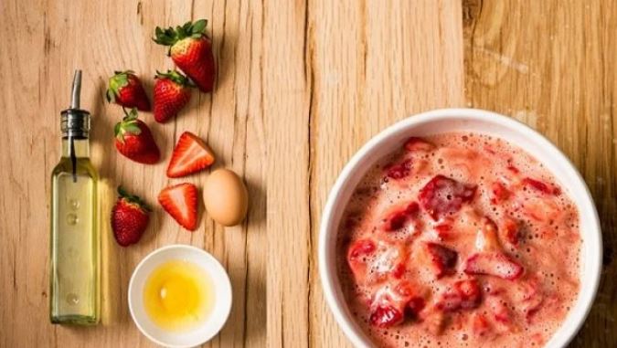 - Sau khi rửa sạch, bỏ cuống rồi nghiền nhuyễn dâu tây, bạn hãy cho thêm mật ong và dầu oliu vào trong bát, trộn thật đều.