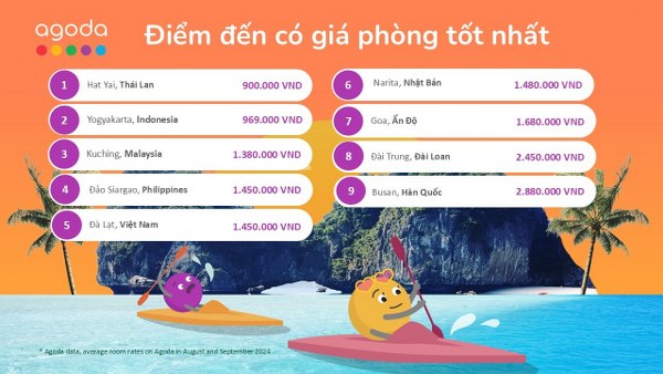 Danh sách của Agoda tập hợp những điểm du lịch nổi tiếng nhất châu Á với nhiều ưu đãi đặt phòng hấp dẫn khi các kỳ nghỉ, các lễ hội Châu Á sắp đến gần, trong đó có lễ Quốc Khánh 2/9 tại Việt Nam. Dựa trên giá phòng trung bình thấp nhất từ ngày 15 tháng 8 đến ngày 30 tháng 9, các điểm đến tại chín thị trường châu Á được xếp hạng từ cao đến thấp bao gồm: Hat Yai (Thái Lan), Yogyakarta (Indonesia), Kuching (Malaysia), Đảo Siargao (Philippines), Đà Lạt (Việt Nam), Narita (Nhật Bản), Goa (Ấn Độ), Đài Trung (Đài Loan) và Busan (Hàn Quốc).