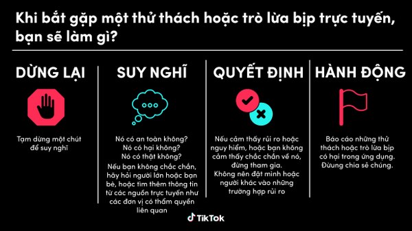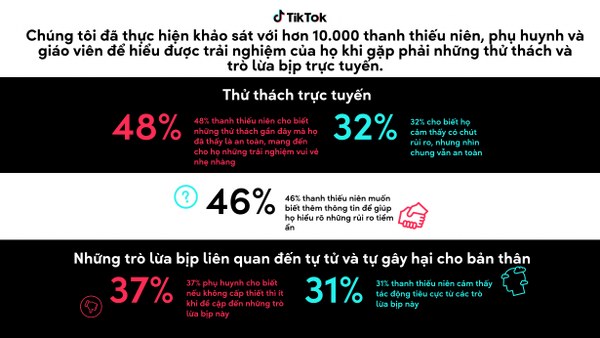 Một phát hiện đáng chú ý nữa trong báo cáo này chính là việc trẻ vị thành niên, phụ huynh và các nhà giáo dục đều cần được tiếp cận với nguồn thông tin chi tiết, xác thực về những thử thách và trò lừa bịp trực tuyến. Thấu hiểu điều này, TikTok đã phối hợp cùng Tiến sĩ Graham, Brion-Meisels và Anne Collier (Nhà sáng lập và Giám đốc điều hành The Net Safety Collaborative) để phát triển một nguồn tài nguyên hoàn toàn mới chuyên giải đáp các thắc mắc của cộng đồng về thử thách và trò lừa bịp trực tuyến. TikTok mong rằng nguồn tài nguyên mới này sẽ giúp các bậc phụ huynh có cách tiếp cận phù hợp khi thảo luận và định hướng cho con cái.