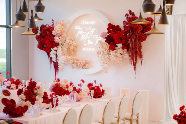 Không gian đám hỏi sử dụng tông hồng - trắng - đỏ làm chủ đạo, mọi chi tiết được cặp đôi chuẩn bị chỉn chu, tinh tế.