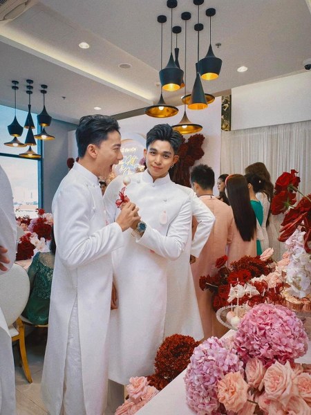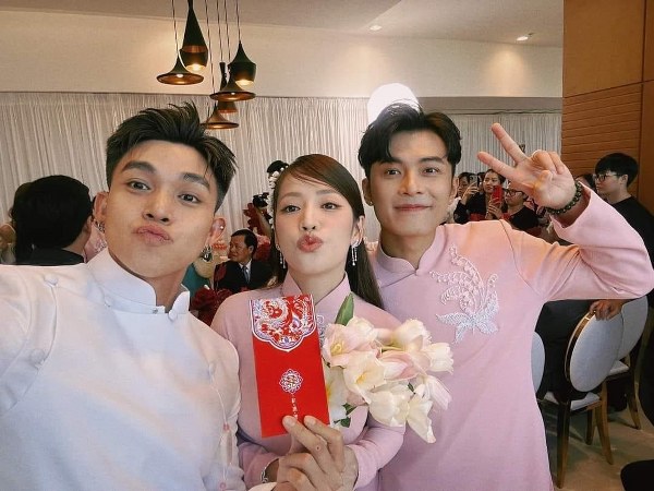 Gin Tuấn Kiệt và Puka rạng rỡ chụp hình cùng Jun Phạm trong đám hỏi sáng nay.