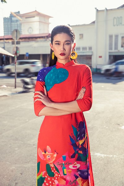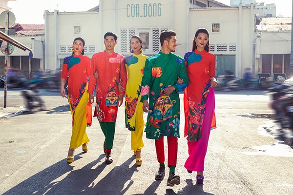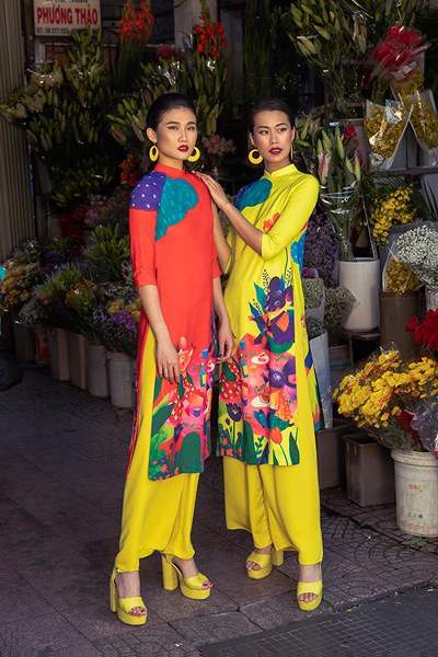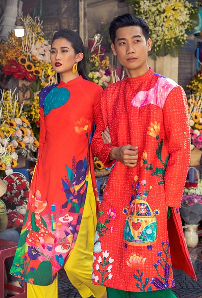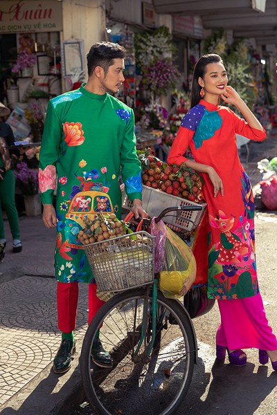 Bên cạnh những gam màu bắt mắt như xanh lá, vàng rực, hồng sen… các mẫu áo dài còn được tô điểm hoạ tiết hoa lá và những chú chuột xinh xắn.