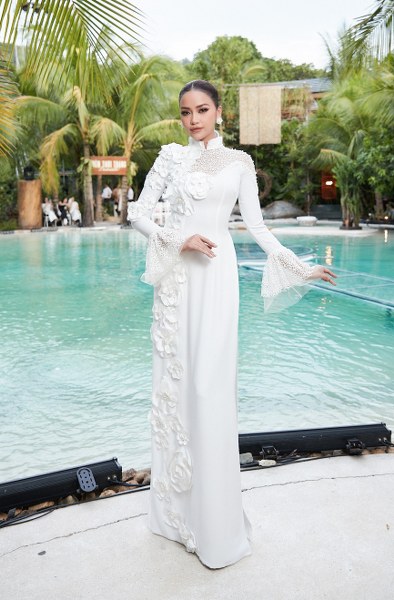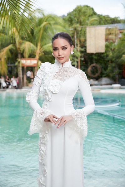 Hoa hậu Hoàn vũ Việt Nam 2022 Ngọc Châu chọn áo dài trắng thướt tha với phần tay áo cách điệu, tà áo sử dụng kỹ thuật kết hoa tinh xảo.