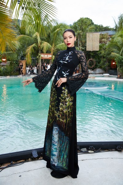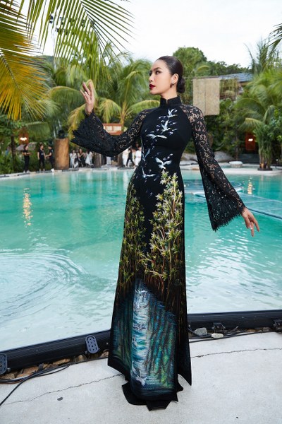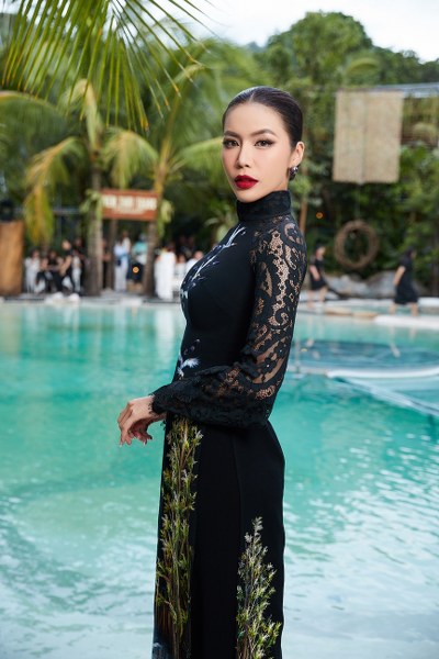 Siêu mẫu Minh Tú diện thiết kế màu đen phối ren cùng hoạ tiết nổi bật.