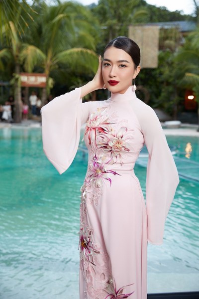 Á hậu Lệ Hằng đẹp sắc sảo, phong cách trang điểm nổi bật. Cô diện áo dài hồng mềm mại, duyên dáng. Áo dài sử dụng chất liệu lụa truyền thống, cắt may tinh tế, giúp cô khoe đường cong hút mắt.