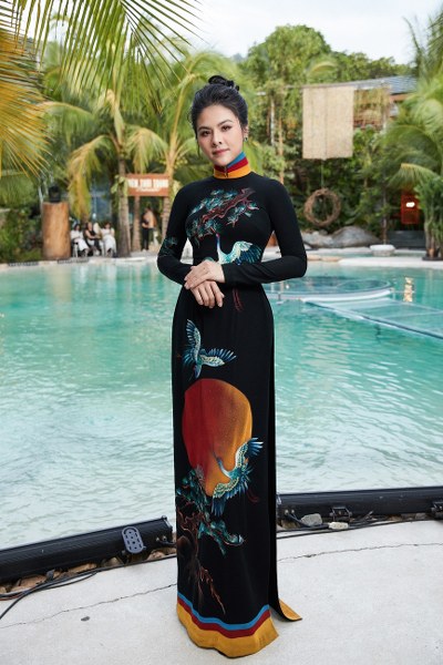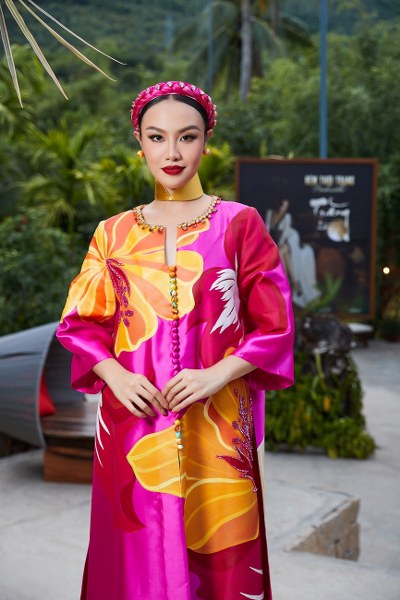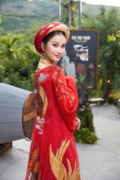 Người đẹp Hương Ly quyền lực, lôi cuốn trong tà áo dài đỏ có hoạ tiết nổi bật. Thiết kế có nhiều chi tiết thêu tay độc đáo, được đầu tư công phu, kỹ lưỡng.