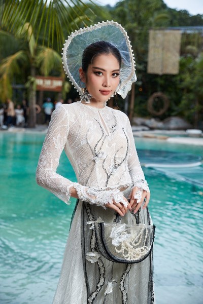 Người đẹp Lệ Nam diện áo dài phối ren kết hợp mũ lưới lạ mắt.
