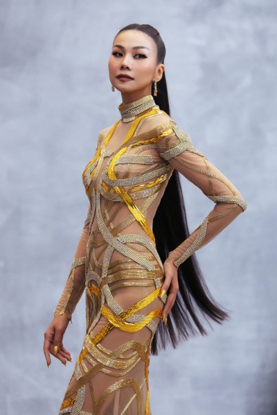 Thanh Hằng khoe thần thái chuẩn 'chị đại' khi diện thiết kế cổ cao ôm sát với các dải đá được đính kết linh hoạt theo tone vàng ánh kim trên nền vải xuyên thấu. Nàng mẫu trang điểm sắc sảo, để kiểu tóc buộc đuôi ngựa và chọn phụ kiện đồng màu.