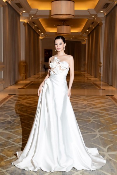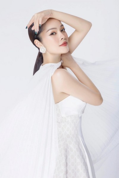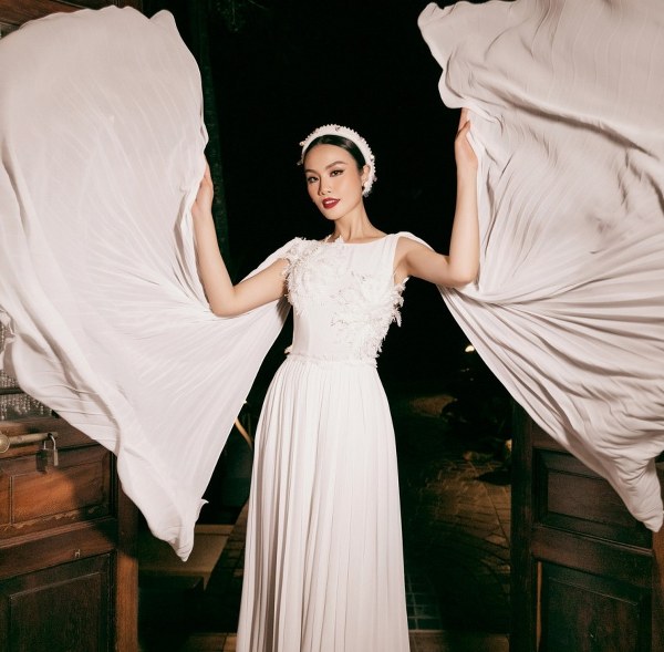 Thuỷ Tiên tạo dáng trong thiết kế bay bổng màu trắng với các chi tiết xếp ly được sắp xếp hài hòa tại chân váy và phần tà hai bên vai. Bên cạnh đó, phần hoa đính nổi cùng chiếc mấn đồng điệu với trang phục giúp diện mạo á hậu trở nên duyên dáng hơn.
