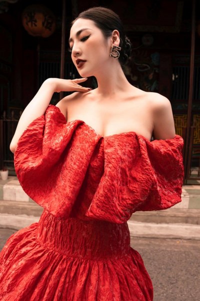 Á hậu Tú Anh khoe khéo bờ vai thon và làn da không tì vết trong thiết kế màu đỏ mang chất liệu tafta gấm với những điểm cắt may phá cách, đặc biệt là phần thân dưới được lấy cảm hứng từ chiếc đèn lồng đậm chất Á Đông. Cô chọn màu son thẫm ấn tượng và búi tóc kiểu truyền thống.