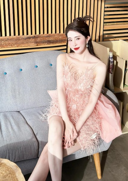 Quỳnh Nga khoe làn da 'phát sáng' khi diện thiết kế màu hồng pastel được kết hợp giữa hai chất liệu voan và lông đà điểu sợi dài. Nữ diễn viên búi tóc đuôi gà trendy và trang điểm nhấn vào đôi môi đỏ.