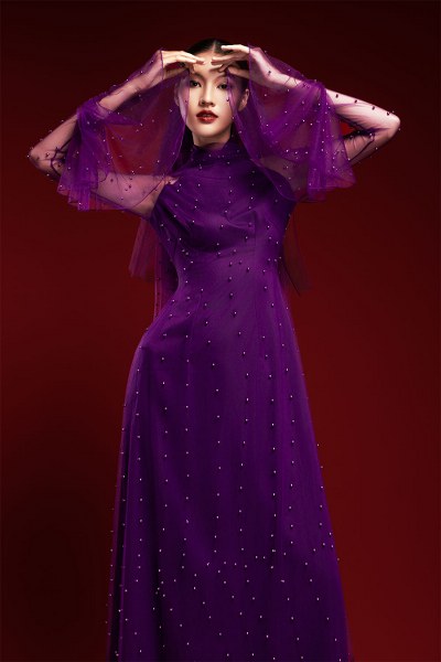 "Tôi đã đến Huế nhiều lần và lần nào cũng mang về cảm xúc khác nhau. Nhưng điều khiến tôi day dứt muốn nói thay bằng ngôn ngữ thời trang, chính là sắc tím - màu của Huế, màu của một vùng đất đậm sâu bản sắc", NTK Đức Hùng chia sẻ.