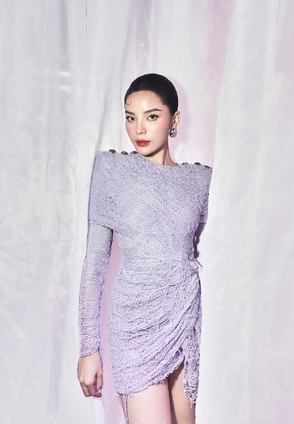 Một trong các mẫu thiết kế được Miss Universe Vietnam 2024 Nguyễn Cao Kỳ Duyên diện trong một sự kiện sau đăng quang. Thiết kế tông màu tím nhạt, được đan móc thủ công với điểm nhấn ở phần cầu vai, eo và chân váy.