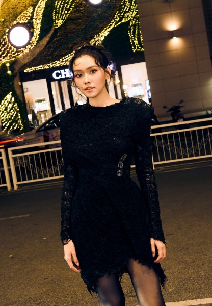 Tường San diện một mẫu váy khác với tông đen huyền bí pha trộn chất liệu ren.