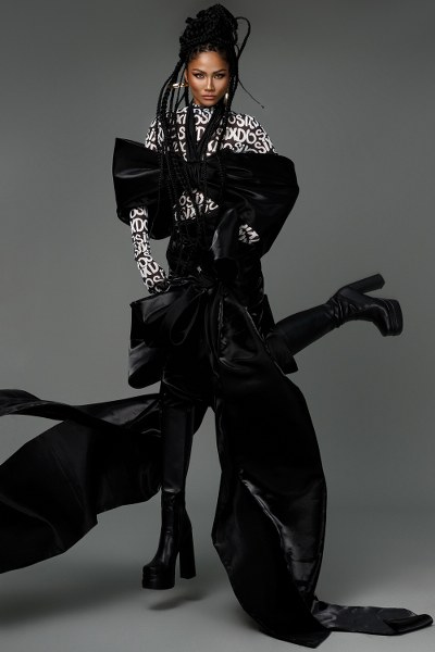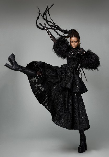 Hoa hậu H’Hen Niê diện bodysuit bên trong, phối cùng trang phục được tạo phom 3D ấn tượng bên ngoài. Vẻ cá tính của trang phục được tô điểm bởi tóc tết bím nhỏ, giày boots da cao cổ.