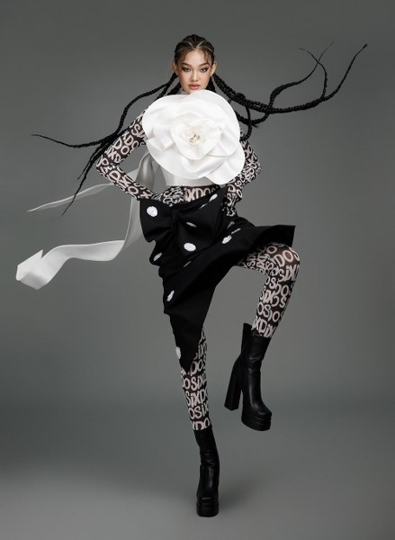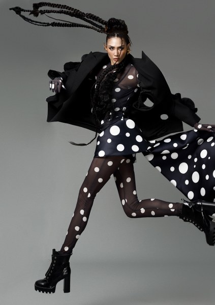 Á hậu Võ Hoàng Yến diện trang phục với chi tiết chấm bi trắng làm điểm nhấn trên nền đen. NTK kết hợp bodysuit, chân váy bất đối xứng cùng áo khoác bên ngoài. Các thiết kế đều tô đậm tinh thần ứng dụng, nhưng được phối theo cách mới lạ, ấn tượng.