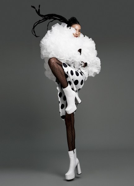 Người mẫu Lê Thuý diện áo khoác làm bằng vải xuyên thấu, xếp lớp nhiều tầng tạo hiệu ứng thị giác, phối cùng trang phục chấm bi to bản, với hai màu trắng đen tương phản. Chất nữ tính vẫn thể hiện rõ trong phom dáng trang phục.