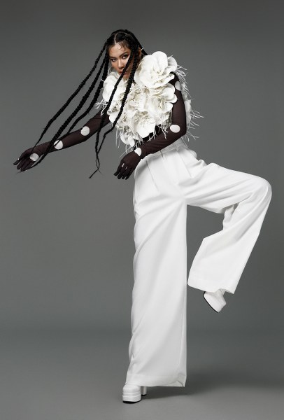 Quần âu ống rộng là một trong những item được NTK tích cực lăng xê qua nhiều BST, hiện là xu hướng rất được ưa chuộng. Người mẫu Kim Dung được diện mẫu quần này, kết hợp áo hoa 3D kỳ công. Áo hoa 3D là một trong những điểm nhấn nổi bật trong các thiết kế.