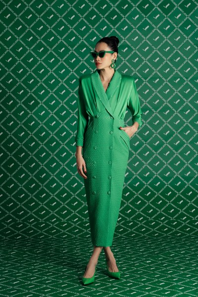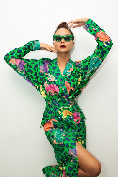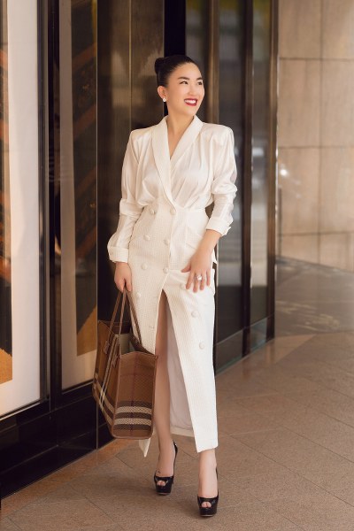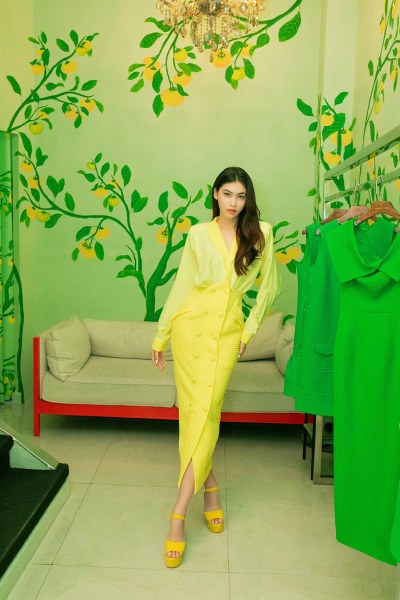 Thanh Trúc Trương là người đẹp đầu tiên diện kiểu váy dáng classic khi quảng bá bộ sưu tập mới cho hai nhà mốt Việt.