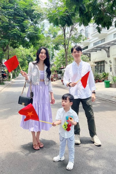 Á hậu Thúy Vân đi chơi dịp nghỉ lễ trong bộ váy tím cạp cao cùng bra top đồng điệu, khoác áo vải tweed. Túi Chanel cùng dép Hermes giúp cô tăng vẻ sang trọng.