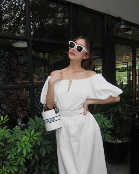 Người đẹp diện phong cách white on white, kết hợp váy khoét lưng cùng túi xô của Dior và kính râm.