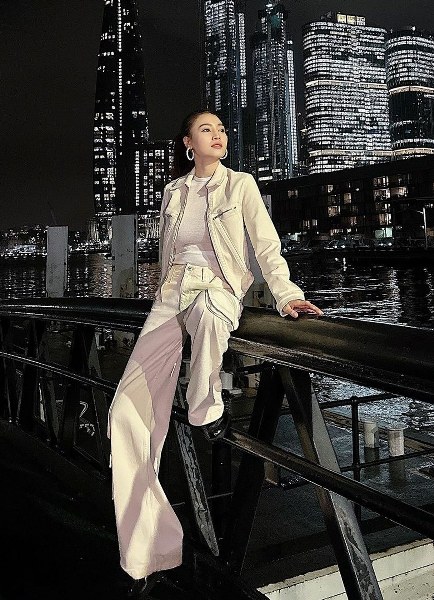 Ninh Dương Lan Ngọc theo đuổi mốt denim - xu hướng hot của thế giới hai năm qua. Cô chọn cách phối denim on denim với tông trắng và tank top đồng điệu.