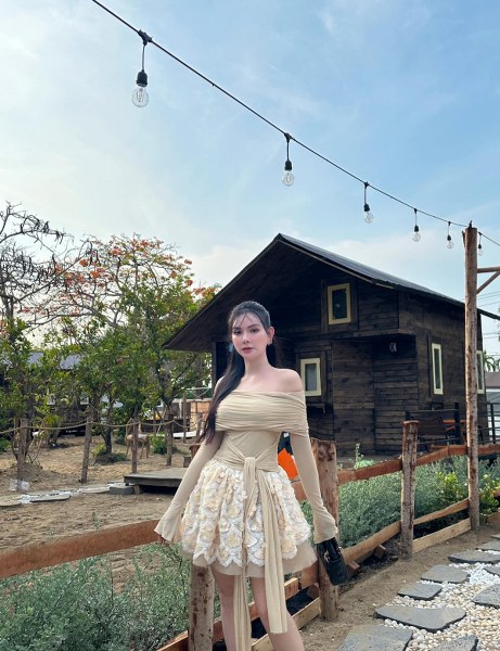 Ca sĩ Thu Thủy diện váy trễ vai cùng túi Lady của Dior trong chuyến cắm trại ở ngoại thành Tp.HCM.