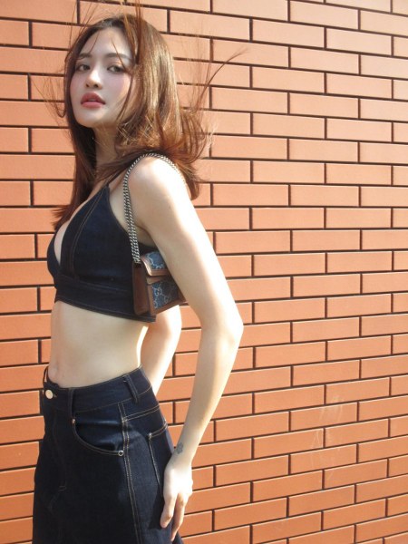 Diễn viên Thùy Anh diện phong cách thập niên 1990 với bra top kèm chân váy cạp cao, túi đeo vai của Gucci.
