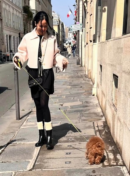 Ca sĩ Hồng Nhung đang tận hưởng khoảng thời gian nghỉ ngơi ở Paris. Cô dắt chó cưng đi dạo với bộ đồ đơn sắc được phối tươm tất, gồm váy đen, áo khoác cùng bốt cổ lông.