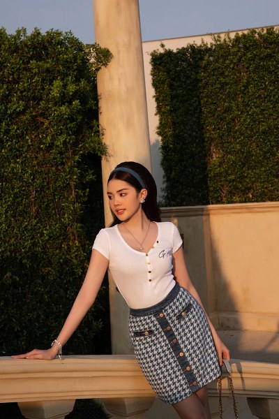 Đan Tiên tâm sự cô theo đuổi hình tượng quý cô sang chảnh, trẻ trung và mang tính xu hướng. Mỹ nhân 9X chọn các trang phục mang tông màu pastel chủ đạo như hồng, trắng, xám nhạt đến từ các local brand Việt, phối cùng phụ kiện và túi xách Gucci, Chloe, Vivienne Westwood, Swarovski...