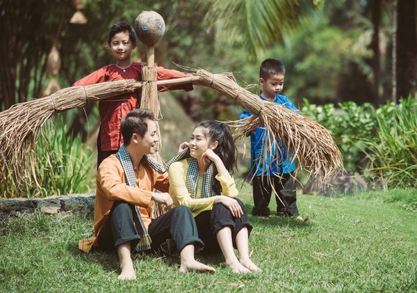 Nam ca sĩ cùng vợ và hai con trai thích thú trải nghiệm cuộc sống bình dị, gần gũi với thiên nhiên nơi làng quê.
